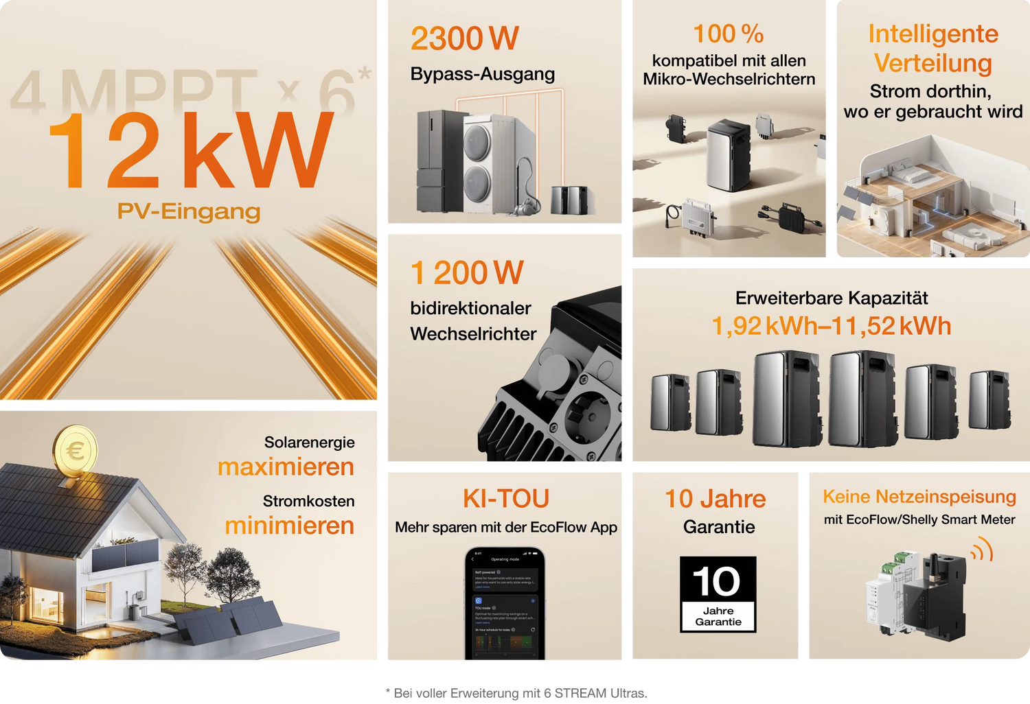 Insgesamt kannst du den EcoFlow STREAM Ultra mit bis zu fünf EcoFlow STREAM AC Pro Speichern kombinieren. Jeder Speicher bietet zusätzliche 1,92 kWh Kapazität, sodass du auf bis zu 11,52 kWh ausbauen kannst.