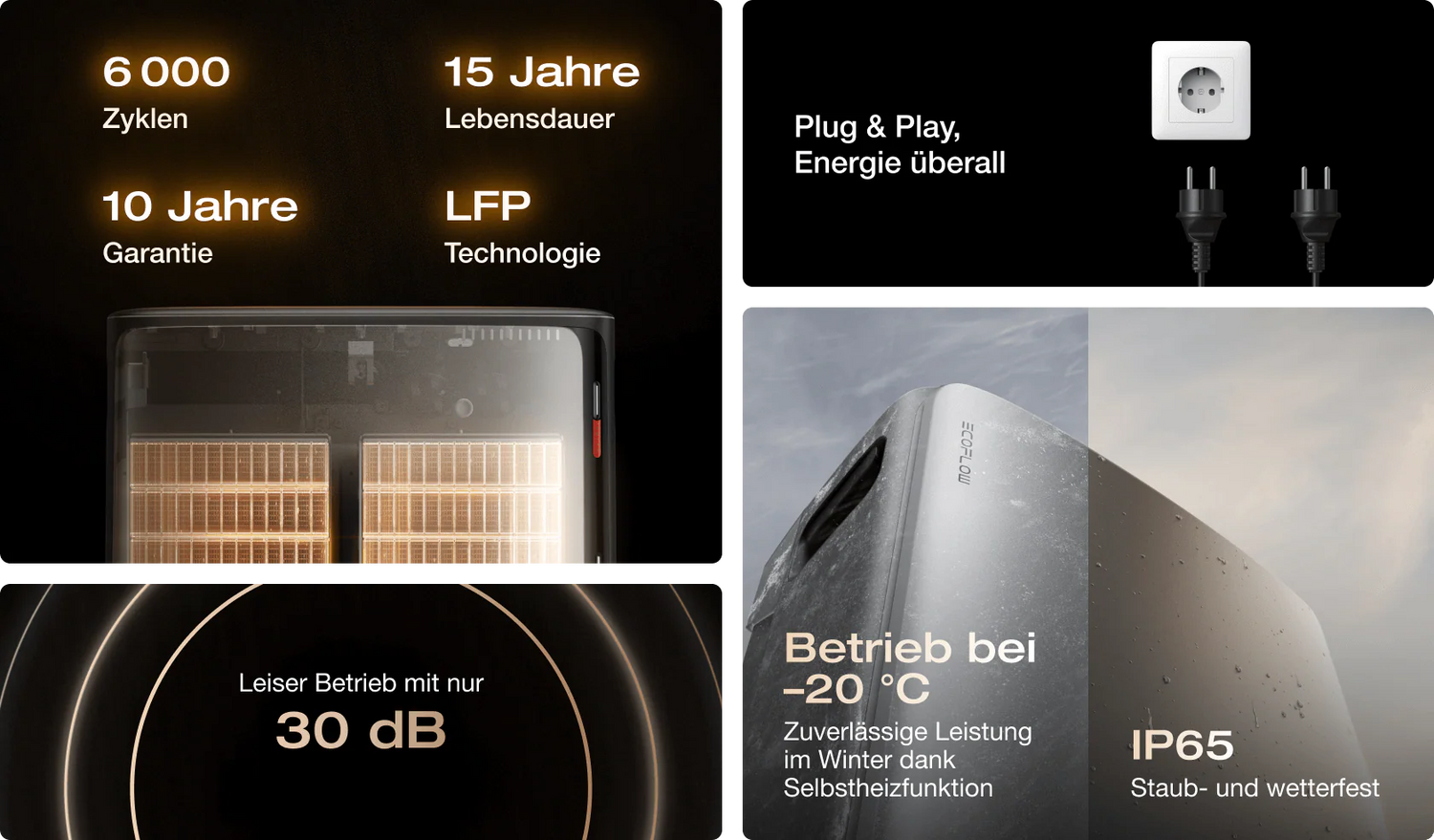 Alles, was du brauchst, ist eine weitere Steckdose innerhalb deines Haushalts. Der Strom fließt automatisch vom Balkonkraftwerk über dein Hausnetz in die Speicher und weiter zu deinen Geräten. Das Ganze funktioniert dezentral, effizient und extrem leise – mit weniger als 30 dB dank lüfterlosem Kühlsystem.