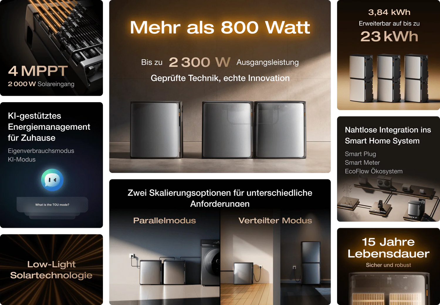 - Integrierter 800W-Wechselrichter – ermöglicht perfekte Kompatibilität