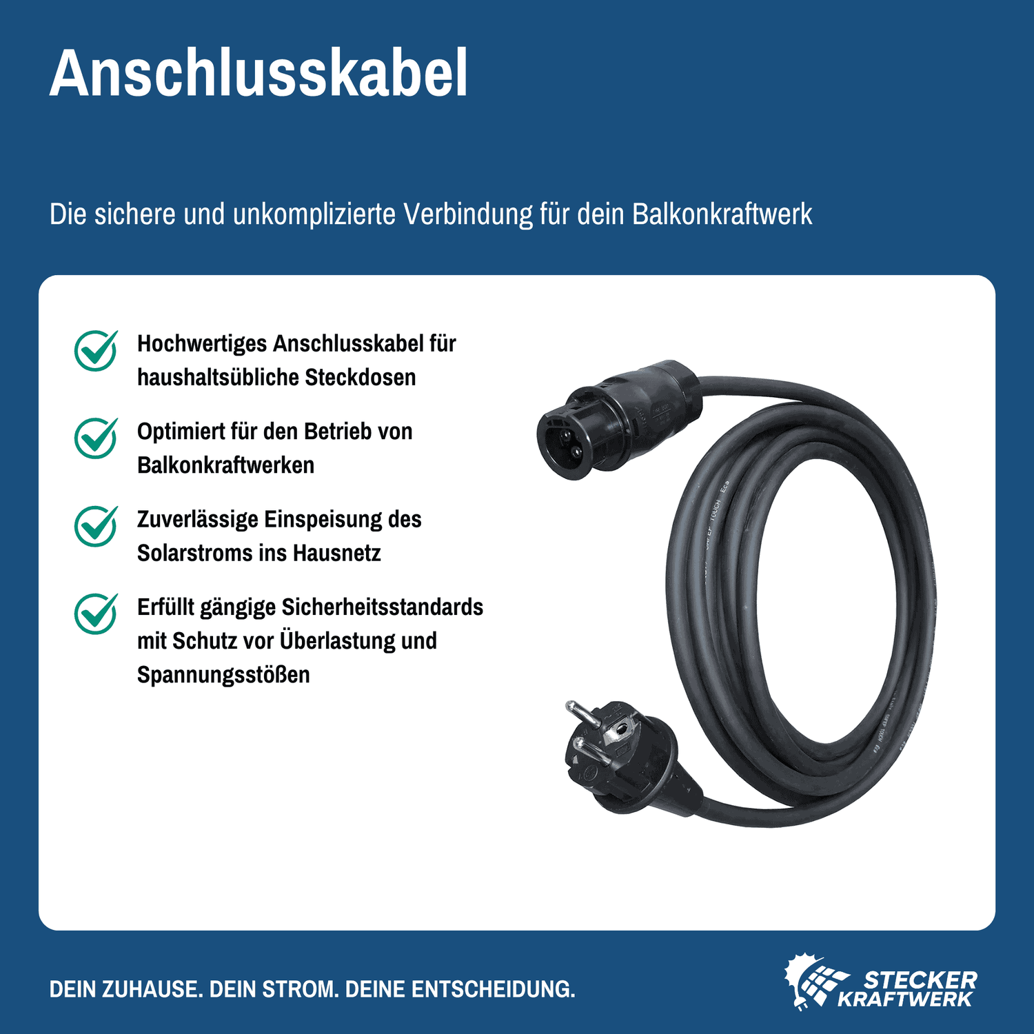 Mit einem hochwertigen Anschlusskabel für Balkonkraftwerke schließen Sie Ihre Solaranlage sicher und unkompliziert an eine haushaltsübliche Steckdose an.