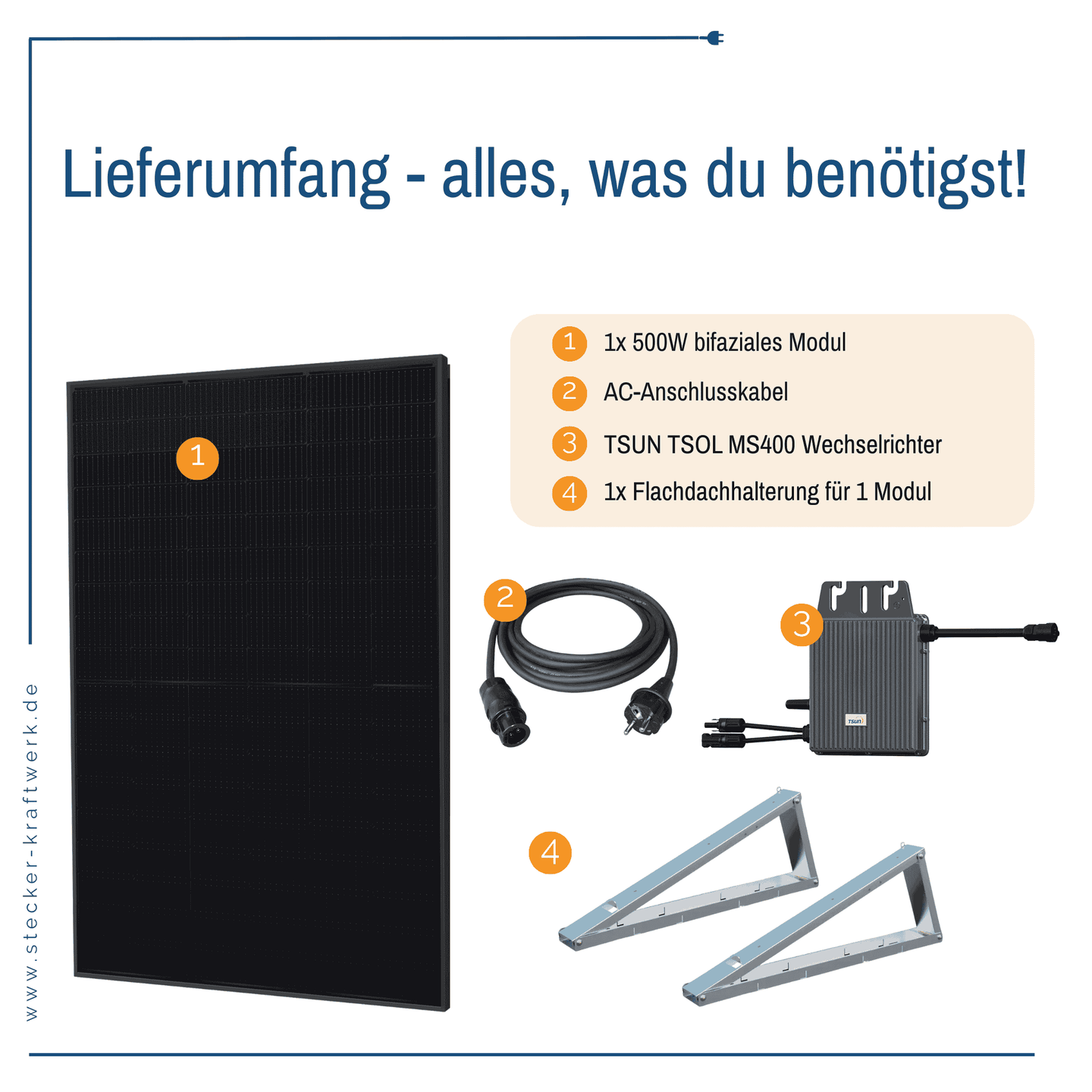 Stecker-Kraftwerk Single fĂĽr Flachdach XL mit 500Wp+